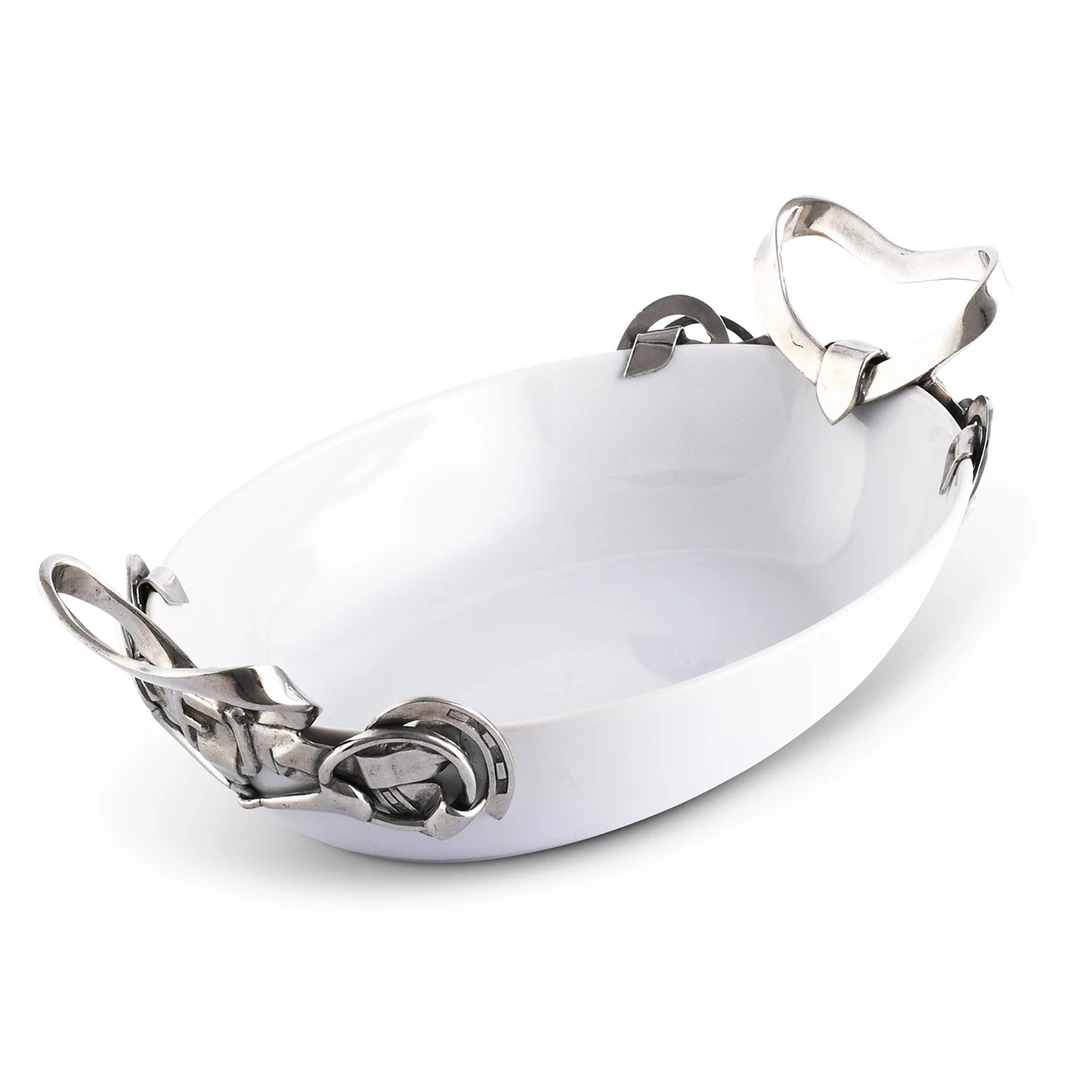 Complement your Equestrian Collection with this attractive Small Horseshoe and Bit Tray. Crafted in luxury-grade pewter, snaffle bits, horseshoes and cinches combine to create innovative handles on this oval piece. These gorgeous designs offer the perfect accent to our elegant stoneware.