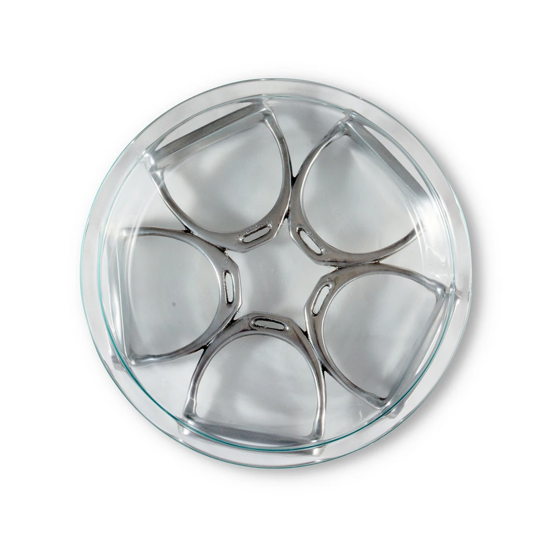 A completely unique Equestrian serve and décor piece, you will only find the Arthur Court Stirrup Trivet and Pie plate here. A ring of 5, true to life detailed, connected stirrup irons, hand-crafted in Arthur Court’s luxury grade proprietary aluminum alloy. The irons support an included clear glass pie plate.
