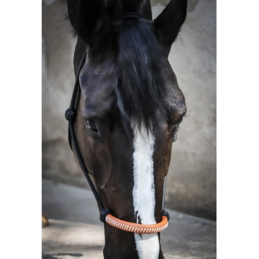 Very similar to its cousin the rope halter (available here), here is the American rope halter. This halter is made of rope, with a leather reinforcement on the noseband. The reinforcement is sewed with a thick white thread contrasting with the hazelnut leather. Fastens on the left, and can be adjusted thanks to a knot. Therefore, can match any horse size. A lead rope can be used thanks to a ring. This halter can be used for hand walking, but also for lunging.