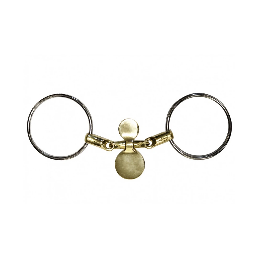 Composed of a German Silver alloy that encourages natural salivation, this loose ring features a 360° pivoting large double disk that lays flat on the tongue at all times so it can prevent the tongue from ever going above the bit.