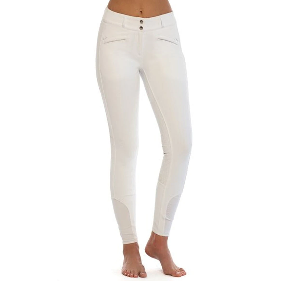 This breech is truly a Miracle breech in a fabric with 24% spandex for incredible stretch, support and recovery. In a flattering mid rise fit. Back comes up higher for a secure and perfect feel. Beautiful seaming on side of leg for a flattering look. Welt zip pockets in front with tiny crystals at edge of pocket and Silver reflective silicone piping. Sock style bottom for a snug fit under your boots. Back has a cross beltloop. Final touch is an embroidered logo with subtle crystal embellishment. This is our new absolute favorite breech!