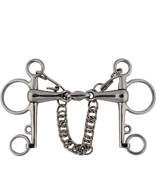 Stainless steel Pelham Bit with cheek length of 150mm, curb chain, and an Elliptical Link double jointed mouth with a thickness of 20mm.