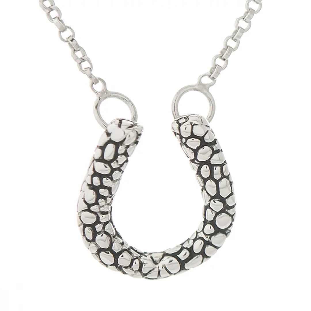 Sterling silver textured horseshoe pendant on chain. Made in USA.