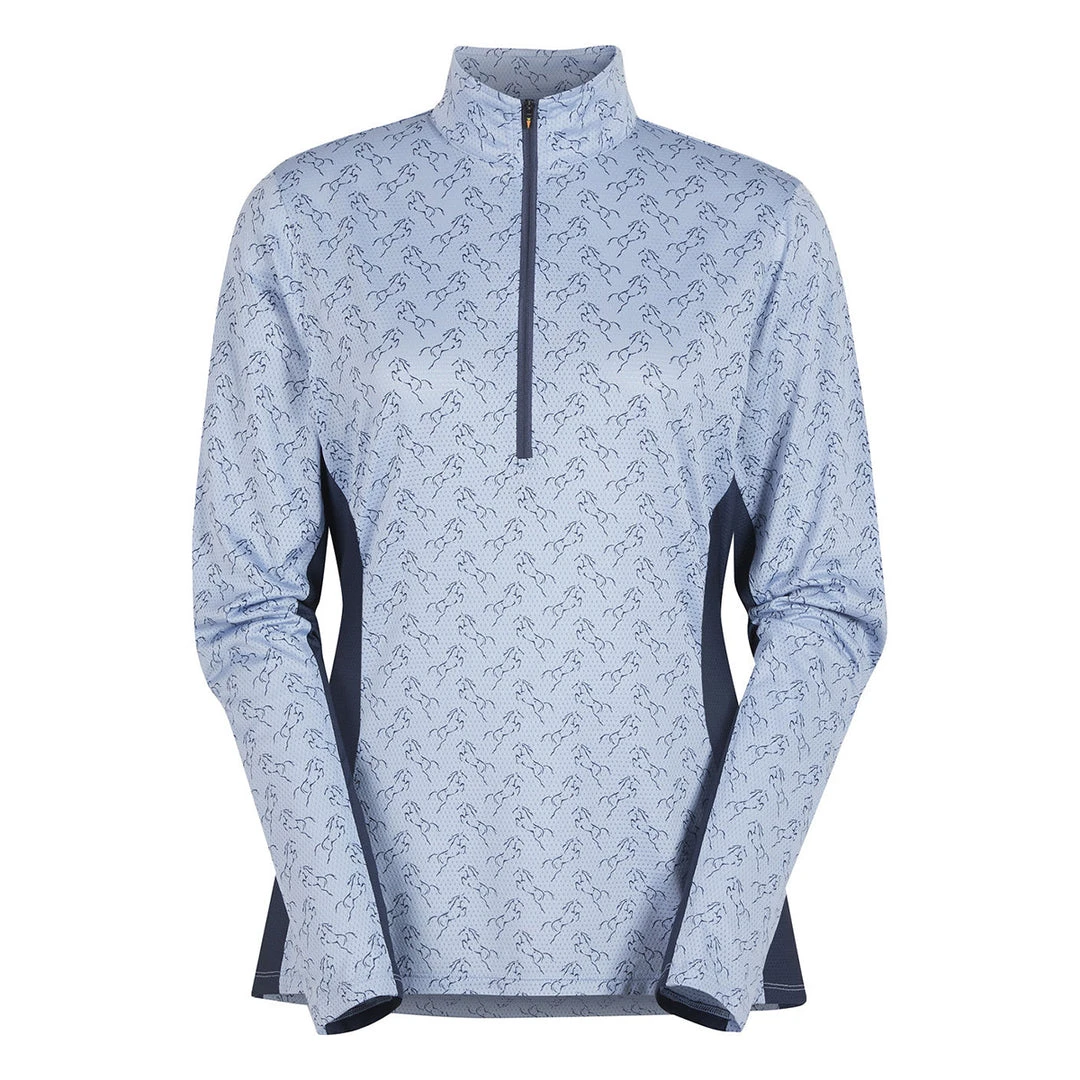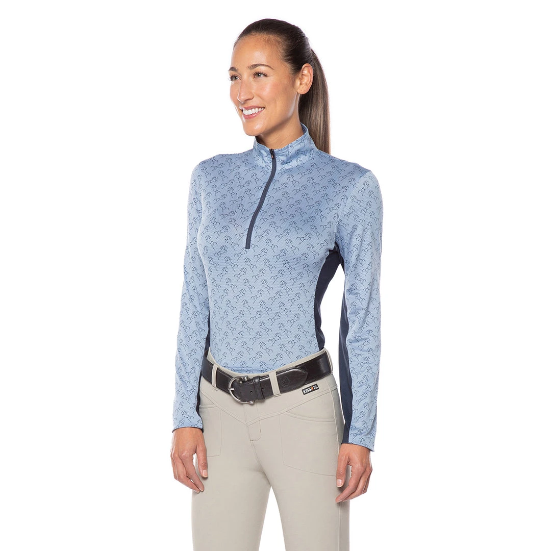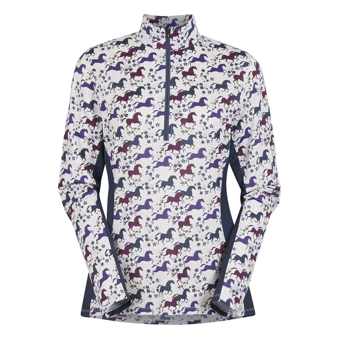 Riders will enjoy cooling coverage on hot, sunny days thanks to this shirt’s featherweight, long sleeve UPF+30 sun protection. Exclusive horse prints are designed to hide dirt, while Ice Fil® fabric works to cool skin’s surface temp up to five degrees. A ten-inch zipper and tall collar protect the neck or allow for increased ventilation. Slimming contrast panels and feminine fit flatter equestrians, while sugar cube pockets let them flatter their steeds.