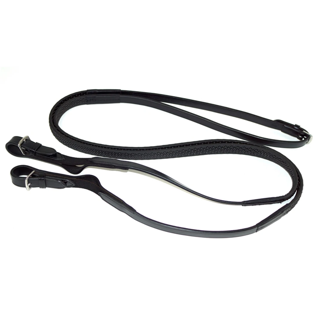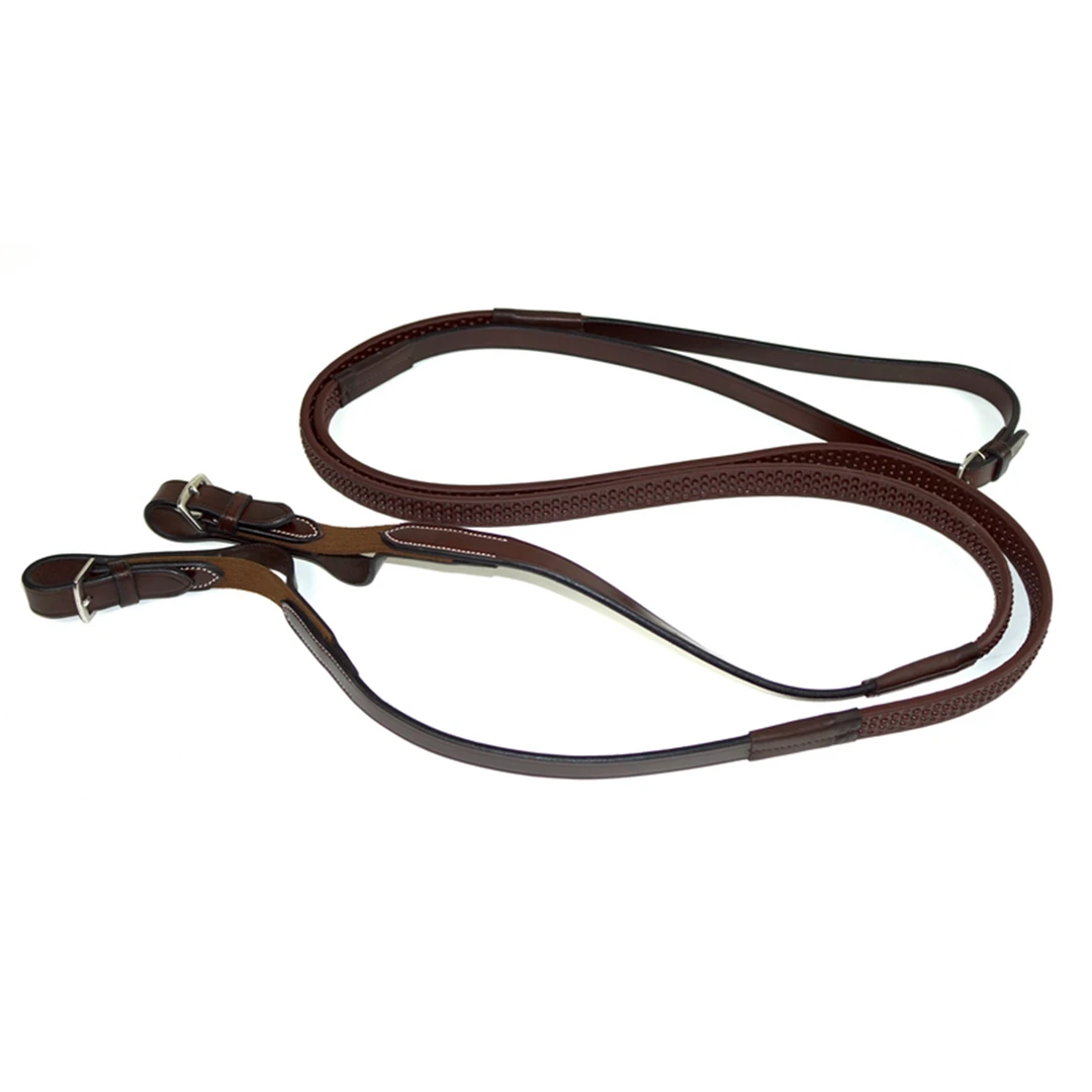 Nunn Finer’s design of the Patented and widely popular Rein-Aid® specification reins that create a softening action between horse and rider combined with our most popular rein, the Soft Grip. The loop of the elastic is limited to the stretch due to the leather backed loop. Created in beautiful Italian leather featuring soft grip rein grip. These reins are sure to become a favorite!