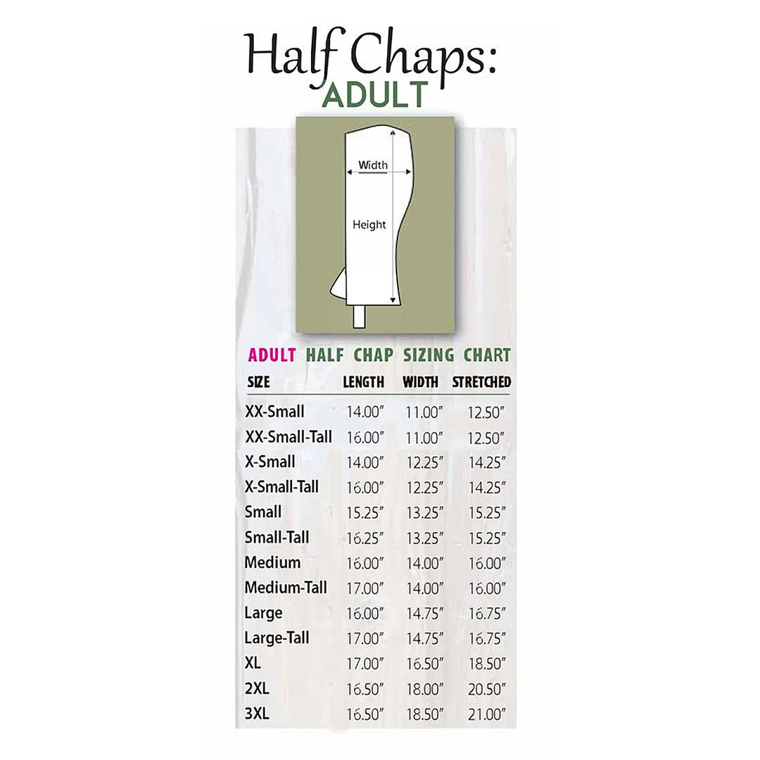 So comfortable, youβll forget to take them off! Perriβs Professional Half Chaps are crafted from soft, premium quality calfskin. Featuring a reinforced inner leg and elasticized leather panel, providing a near custom fit! The stretchable section helps the chap form to your leg for peak performance and comfort. These chaps zip easily from top down and have snaps at the top and bottom to keep the zipper secure while an elastic foot band keeps the chaps in place while riding.