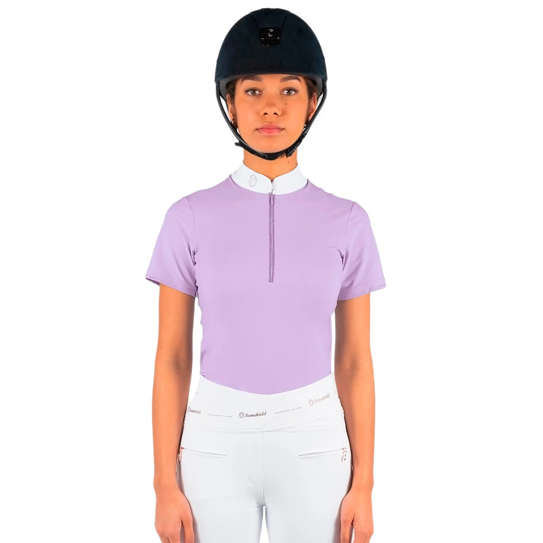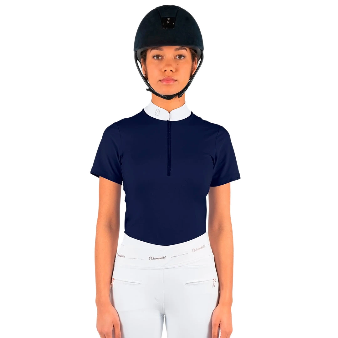 The Aloïse short sleeves shirt is designed with an ultra-soft high stretch fabric which ensures high breathability and comfort. The tailored fit provides an excellent positioning when active for an optimal comfort. The collar closes with an invisible zipper and is embellished with Crystal Fabric Swarovski. The logo Samshield printed on the sleeves, the metal dots blazon on the collar and print and metal dots on the back give the Aloïse top elegance and distinctiveness in a sporty-chic style.