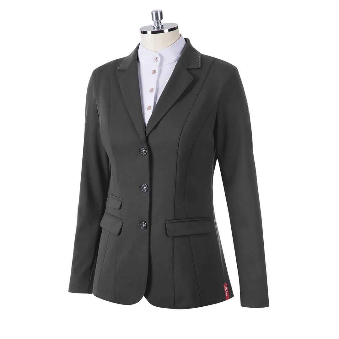 The LisaK is a 3-button coat made with performance technical fabric that is designed to wick moisture and move with you as you ride. Small crystal detailing adorns the jackets collar, pockets, and back seam.