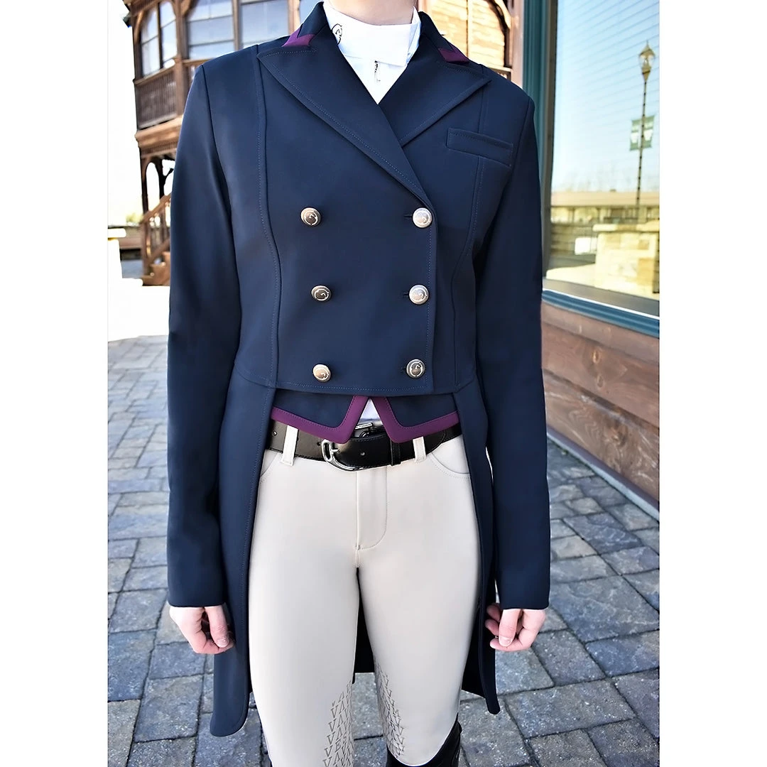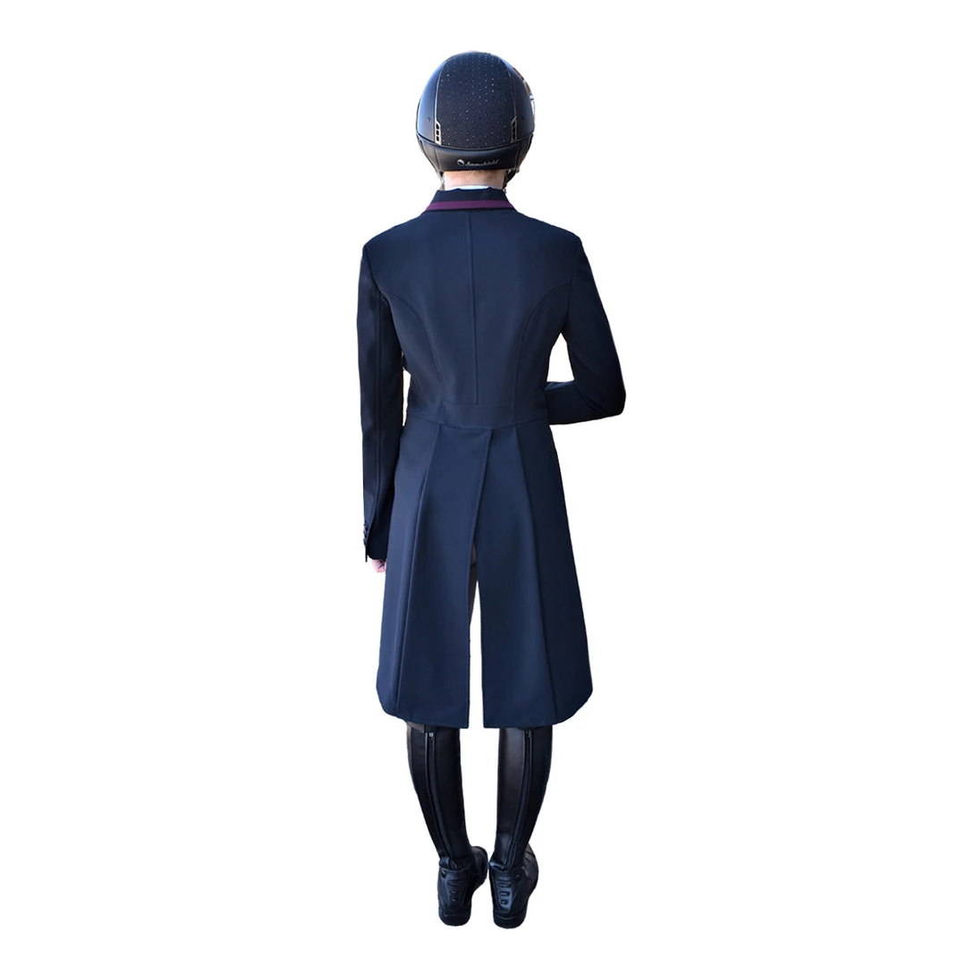 Most elegant among women’s dressage competition coats rises the Costanza. The double faced fabrics gently follow every movement, still maintaining a perfect shape. Tails are finished with removable weights to keep it smoothly extended for the dressage ring, or pop them out to let your tails fly on the derby field. Six buttons to fasten the double-breasted model, three buttons on the cuffs.