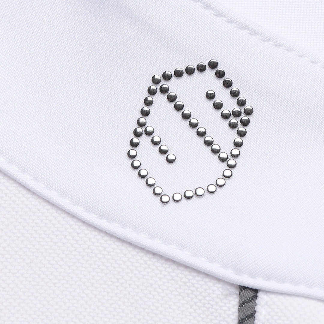 The Harper long-sleeved competition shirt is made from breathable stretch material in technical backstitch. Its tight fit ensures perfect comfort and excellent support. The collar has been festooned with a Samshield logo of metallic dots, and its braids and buttons are covered with iridescent fabric. Available in White with Grey Piping.