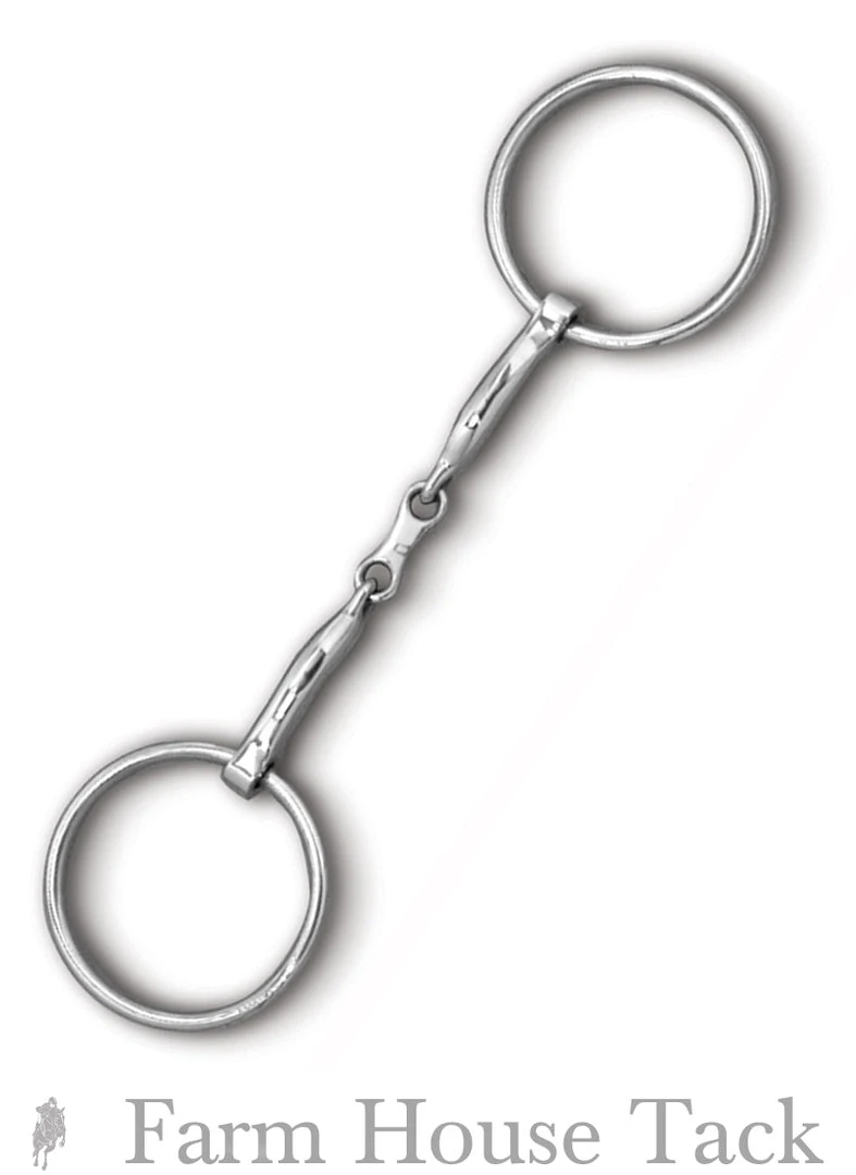 The loose ring is a simple stainless steel “O” shape where both the bridle and mouthpiece have no fixed point of attachment but slide freely around the ring. The loose ring allows a lot of play as the mouthpiece slides freely around the ring.