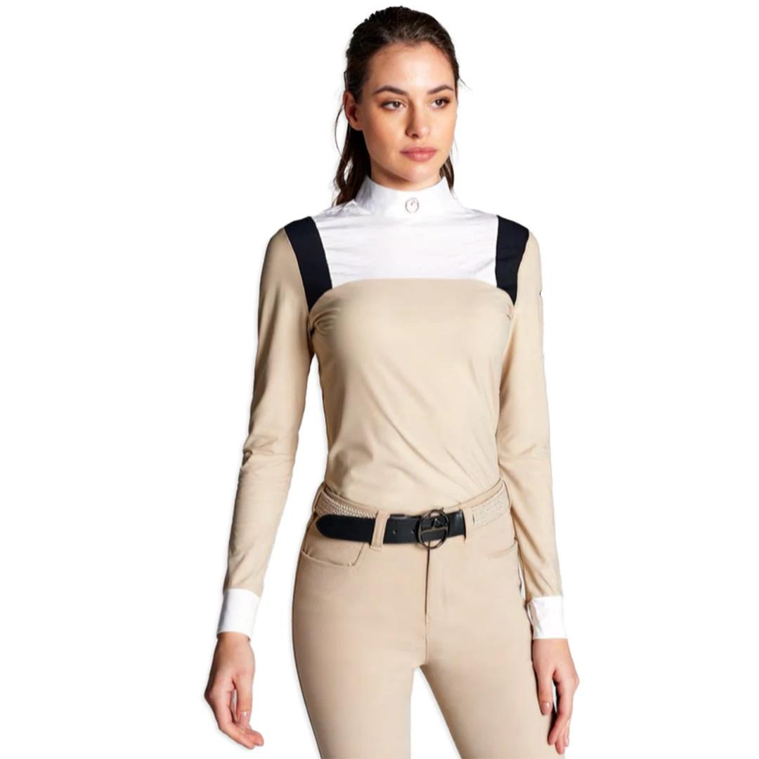 Classic long sleeve show shirt but with an Italian twist you’ve come to love from Vestrum. A sporty look with emblem on collar and a discreet side zip. Choose from 3 different colors to rock in the jumper ring.